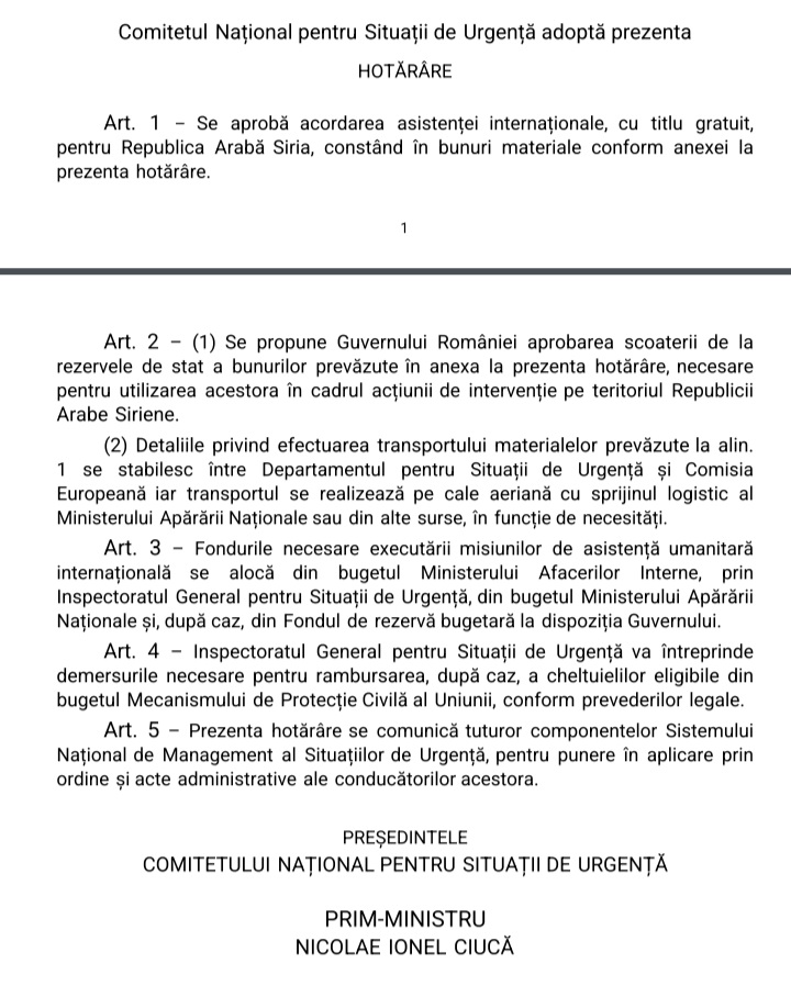 Dată fiind situația generată de cutremurul produs în data de 6 februarie 2023, în Siria, respectiv și solicitarea Republicii Arabe Siriene, prin Mecanismul European de Protecție Civilă, pentru acordarea de asistență internațională, în urma consultării cu președintele României, Klaus Iohannis, în data de 9.02.2023, premierul României, Nicolae-Ionel Ciucă a convocat, în sistem hibrid, Comitetul Național pentru Situații de Urgență.