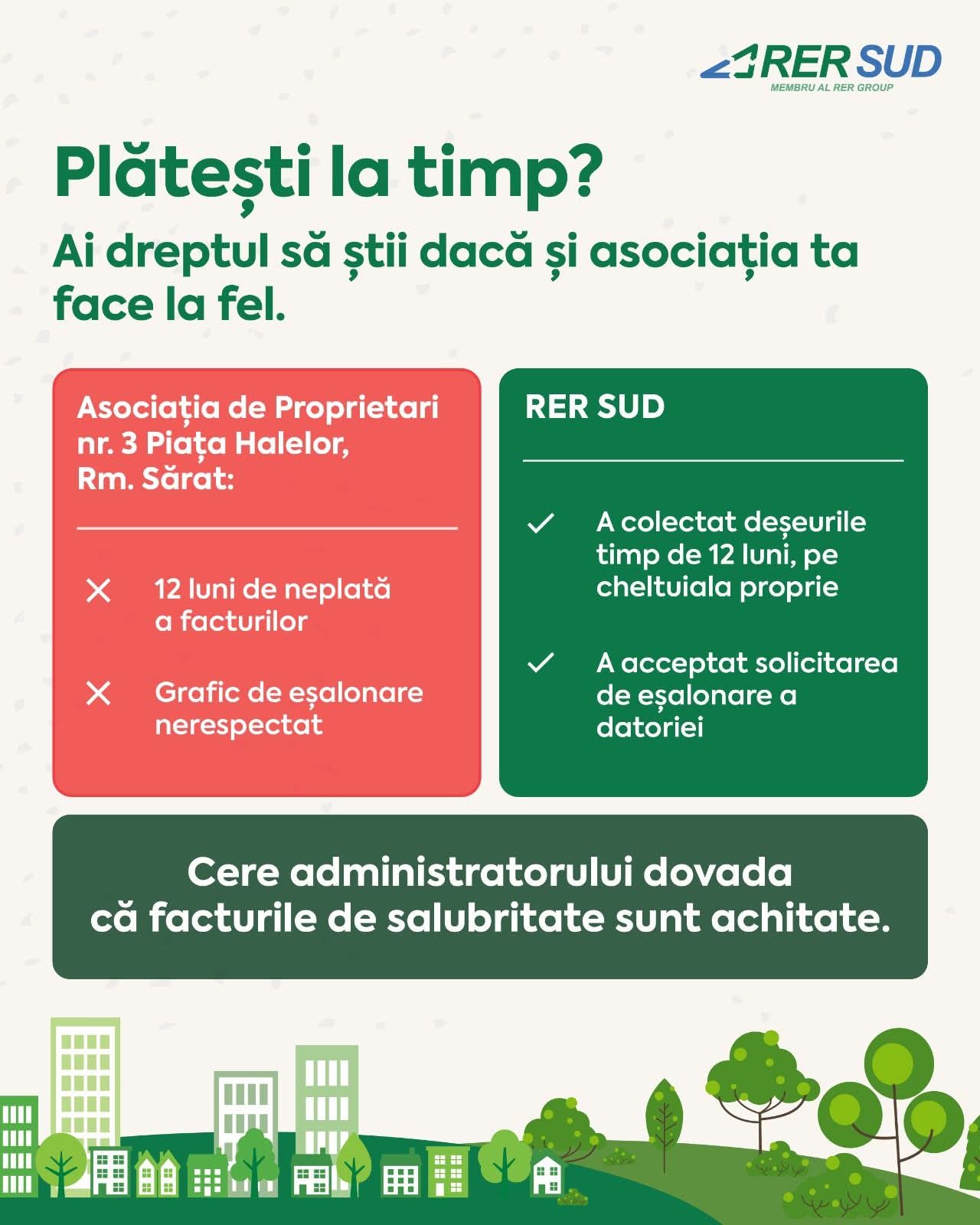 ,, Către locatari: Vă încurajăm să solicitați administratorilor de asociații dovada plății facturilor de salubritate pentru a vă asigura că sumele achitate de dumneavoastră ajung către furnizorul de servicii.